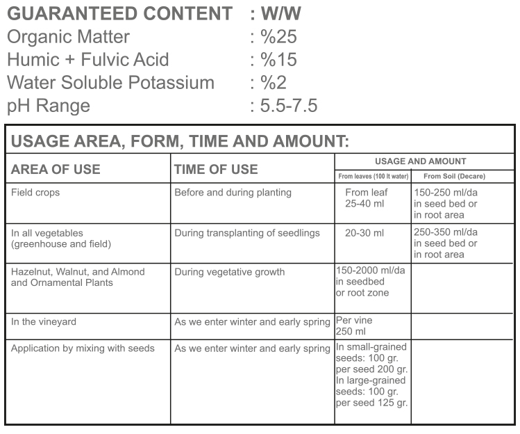 It is a biostimulant that contains humic-fulvic components in its structure. LEONARDIT raw material was used in production. Effects on Physical Properties of Soils: It prevents the formation of crust in the soil. It increases the water retention capacity of the soil. It regulates the movement of water and air within the soil. Increases water intake of plants. Reduces or prevents soil compaction in heavy textured soils. It increases seed germination. Increases root development. Effects on Chemical Properties of Soils: It increases ion exchange and Cation Exchange Capacity (CEC) in the soil. Reduces salt damage. Increases availability and intake of nutritional elements. It increases microorganism activity in the soil and enriches the flora. It regulates pH. Humic components have undertaken important tasks such as controlling plant nutrient availability, ensuring the exchange of Carbon and Oxygen between the soil and the atmosphere, and ensuring the transformation or transportation of toxic chemicals into different components. BİOS BLACK contains humic and fulvic acids.
