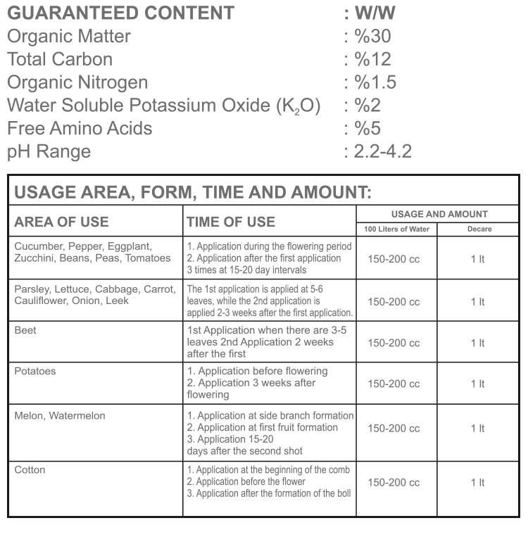 BİOS-BROWN, which we prepared by enriching the content of BİOS, is our biostimulant that complies with organic criteria with the wood vinegar we use in its content and will be your greatest assistant in agricultural control. The basic components of wood vinegar are acetic acid, propionic acid and methanol. Wood vinegar has high concentrations of bactericidal properties due to its high acidity, ethanol and phenol content. In foliar application, it prevents the spread of pathogenic bacteria. Bios-Brown applied to the leaves will increase the resistance of the plant against pests and diseases. While the leaves on which Bios-Brown is applied will have a shiny and dark appearance, it will also increase the taste of the products grown by helping the formation of sugar and amino acids in the plant.