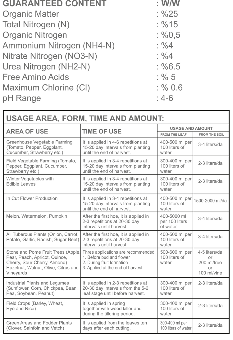 ABİOS-GREEN Nitrogenous Organomineral Fertilizer, for use in conditions where nitrogen supplementation is required, provides high effectiveness with organic substances and amino acids. It is a liquid fertilizer with a high nitrogen content (15%). High nitrogen composition; It is formulated with a combination of nitrate, ammonia and urea forms, and increases the effectiveness very much with organic substances, organic carbon and amino acids. With this feature, it provides fast and effective fertilization without causing drying and burning in the plant. It is recommended when nitrogen is insufficient in the soil or when plants cannot benefit from this nitrogen sufficiently due to various negativities even if it is sufficient, and as a result, it shows growth and development retardation. It is also an ideal nutrient source with organic substances and amino acids for plants that need high levels of nitrogen. Applied from leaves or drip irrigation, BİOS-GREEN shows its effect in a short time.